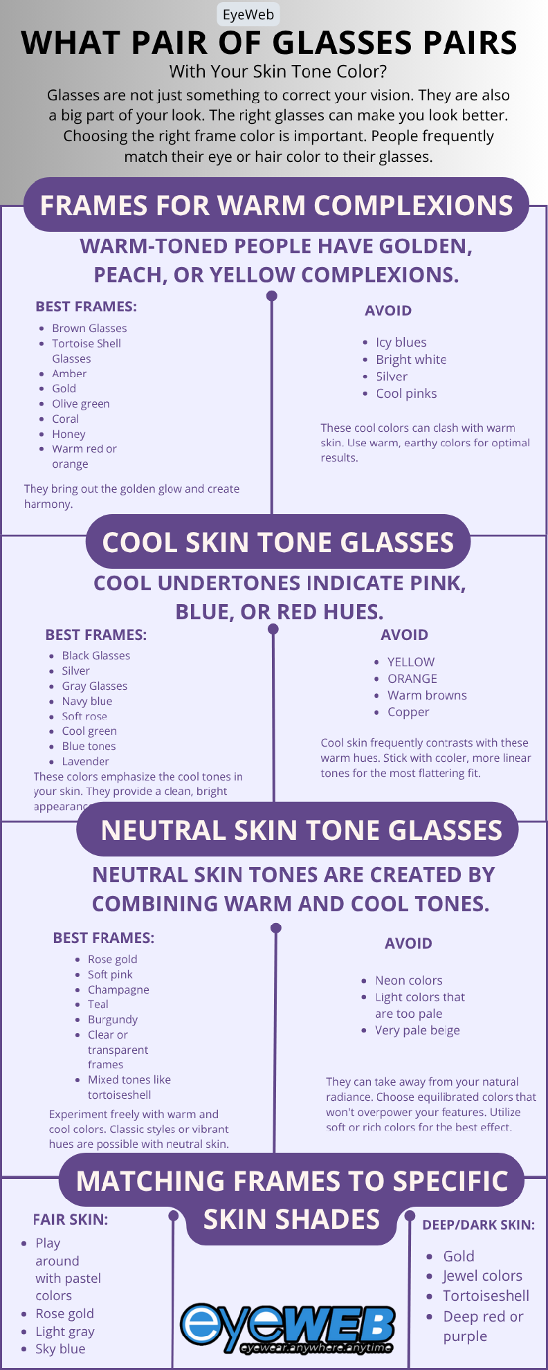 Skin color also comes in shades of fair, medium, and dark. Match your glasses to your skin's depth for a great look.